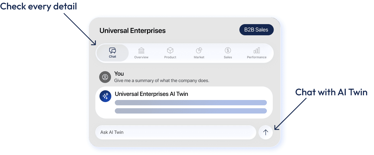 AI Twin captures your unique market position, extracts valuable insights from your success stories, and maps your core value propositions—all accessible through an intuitive conversational interface. Simply chat with AI Twin to uncover customer patterns, refine sales strategies, and make data-driven decisions that accelerate growth.