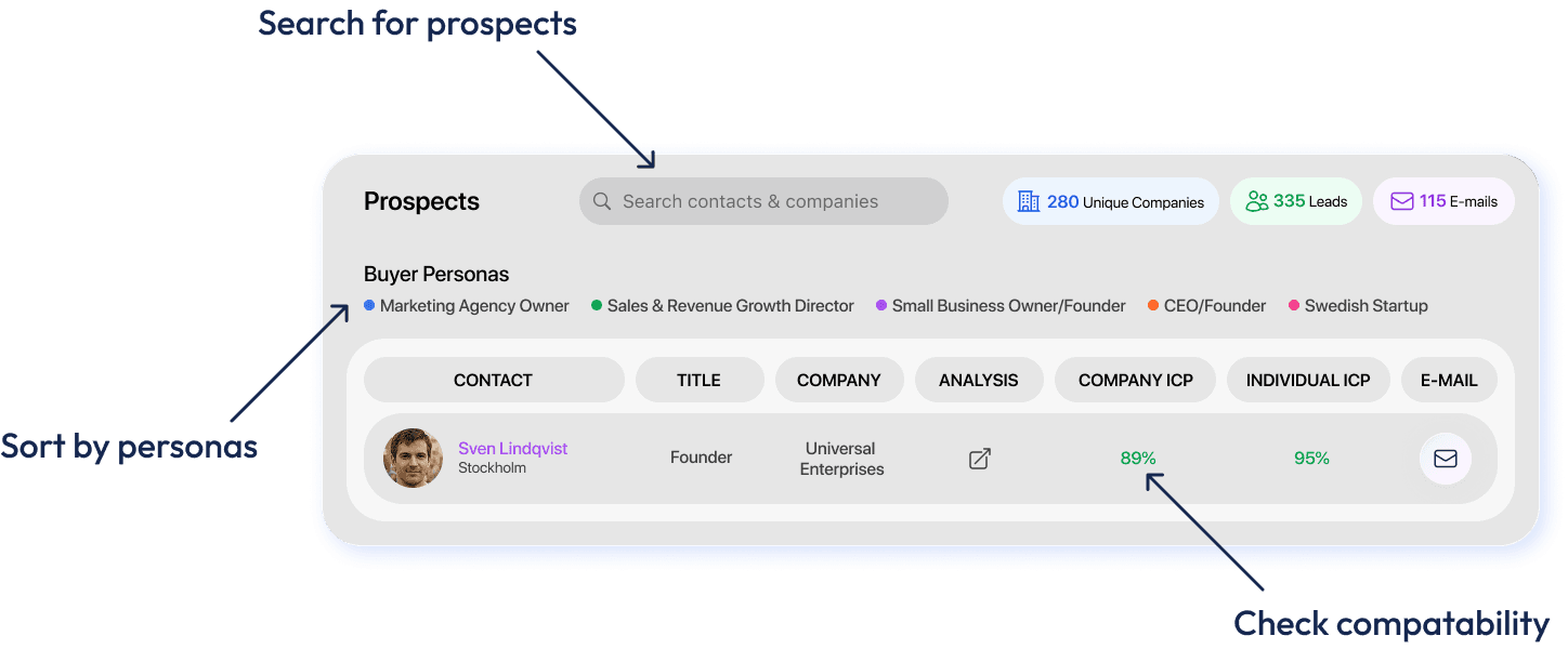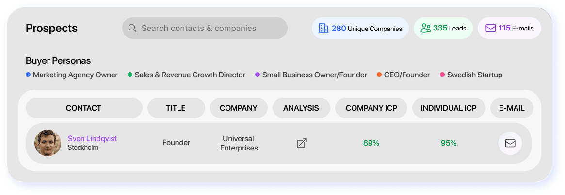 The platform automatically filters contacts and companies based on your criteria, providing detailed compatibility percentages to prioritize outreach. Define your target buyer personas, and AI Twin surfaces the most qualified prospects with comprehensive contact information and compatibility insights, enabling you to focus on leads with the highest conversion potential and streamline your prospecting workflow.