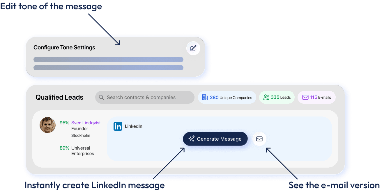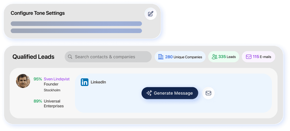 AI Twin creates personalized LinkedIn messages and email campaigns that match your brand voice. It analyzes prospect compatibility to generate targeted messages, seamlessly switching between platforms with one click. Configure your tone once, and AI Twin applies it consistently across all outreach, delivering scalable engagement that drives higher response rates.
